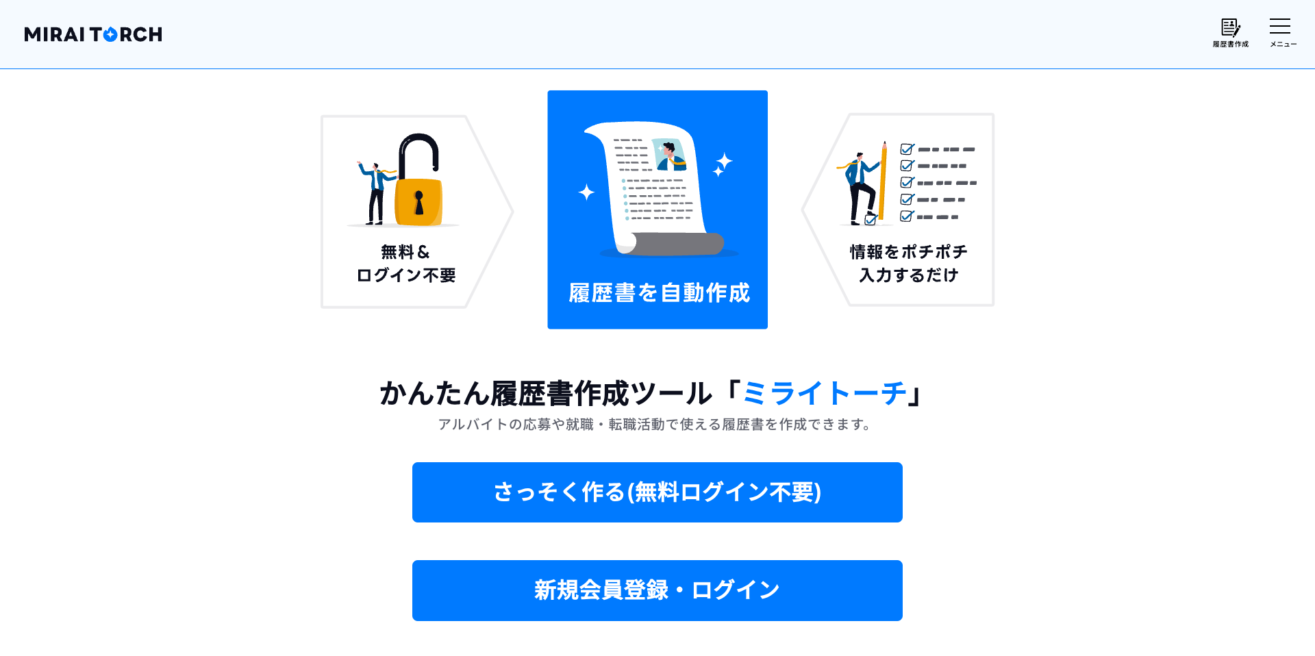 株式会社キュービックが開発したミライトーチは、会員登録不要!情報を入力していくだけで簡単に履歴書を作成することができます。